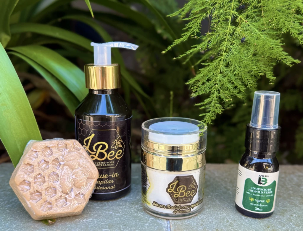 - Mel, própolis, cera e apitoxina estão presentes em quase toda a linha de cosméticos.