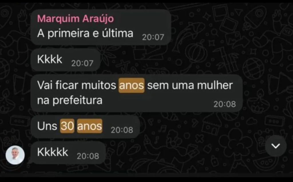 De acordo com o conteúdo que circulou, o vereador teria afirmado. “A primeira e a última”, em referência ao mandato da prefeita. Em seguida, disse: “Vai ficar muitos anos sem uma mulher na prefeitura. Uns 30 anos”.