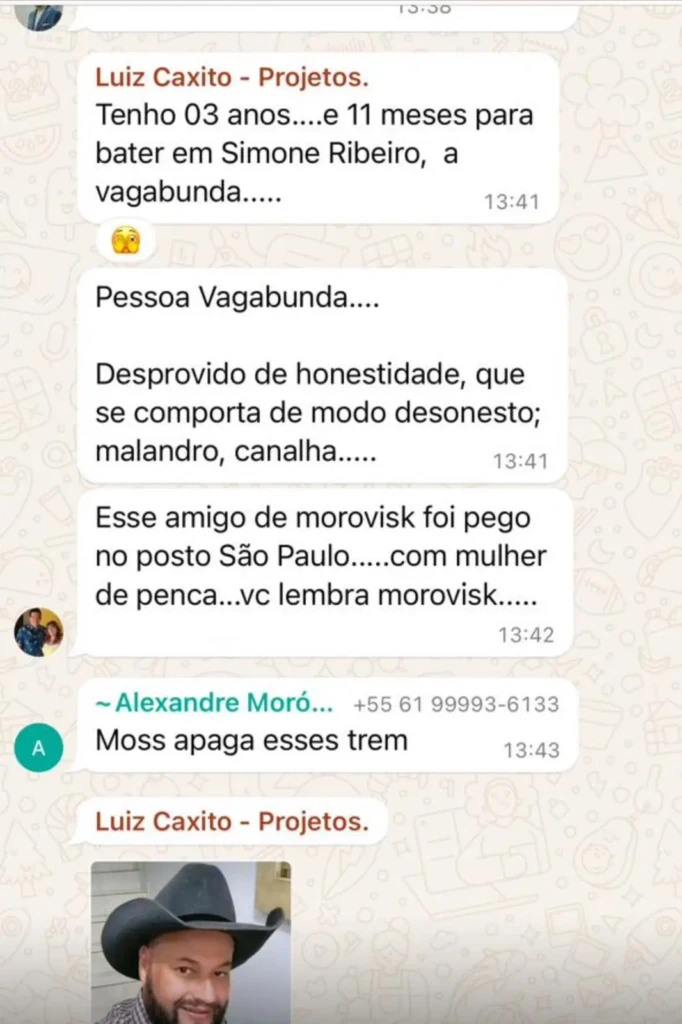 Já em outro caso, também passaram a circular mensagens com tom agressivo em conversas atribuídas a grupos de debate político. Antes dos trechos, houve uma contextualização sobre o conteúdo das mensagens. Entre as falas divulgadas, uma delas diz: “Tenho 03 anos e 11 meses para bater em Simone Ribeiro, a vagabunda…”.